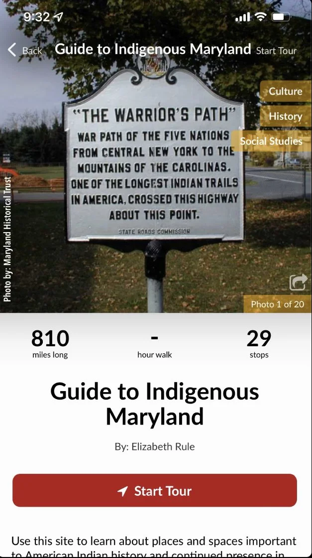 The Guide to Indigenous Maryland is a tour map and mobile application featuring sites of importance to Native peoples across the state of Maryland. The Guide emphasizes Indigenous peoples’ contributions to the state, highlights the historical and contemporary tribal issues, and acknowledges local Indigenous homelands. The Guide showcases the empowering stories of how Maryland is a place of tribal history, gathering, and advocacy with a long, rich history.